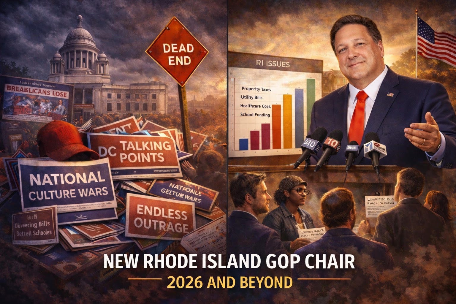 2026 is the stress test. Will the new chair use this moment to build a Rhode Island‑first Republican Party that shows up with serious plans on costs, housing, healthcare, and schools? Or will the party fall back into the comfort of national culture wars and social‑media applause from people who don’t live here? The image shows both roads. The question now is which one the RI GOP will actually choose – and whether independents will ever be given a real reason to take them seriously again.